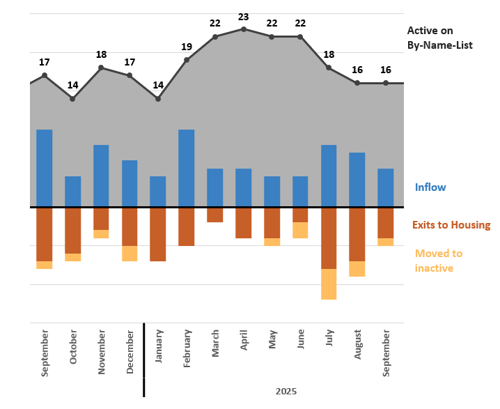 This line and bar graph show the data details related to Veterans experiencing homelessness in Washtenaw County. The line graph at the top shows how many Veterans are active on the community’s By-Name-List every month since September 2024. The blue bars below show the number of Veterans entering the county’s system of care per month; the red shows how many are exiting to permanent housing each month; and the yellow is the number of Veterans no longer active on the community’s By-Name-List.